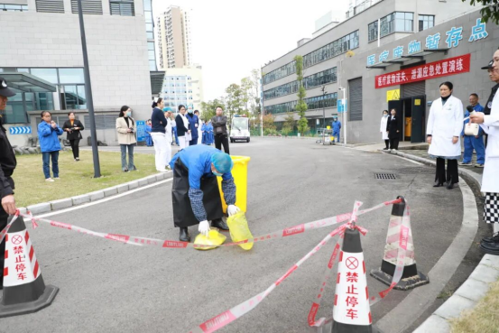 此次演練場景分三個(gè)階段,第一階段進(jìn)行醫(yī)廢流失演練。醫(yī)廢暫存點(diǎn)工人發(fā)現(xiàn)醫(yī)廢流失,通知物業(yè)主管,物業(yè)主管上報(bào)后勤科,后勤科隨后通知安??萍霸焊锌茖?duì)現(xiàn)場進(jìn)行調(diào)查并請(qǐng)示分管院領(lǐng)導(dǎo),安??瓢l(fā)現(xiàn)偷盜人員并控制,院感科指導(dǎo)工人對(duì)被盜醫(yī)廢進(jìn)行轉(zhuǎn)運(yùn),對(duì)現(xiàn)場環(huán)境及轉(zhuǎn)運(yùn)容器進(jìn)行消毒。